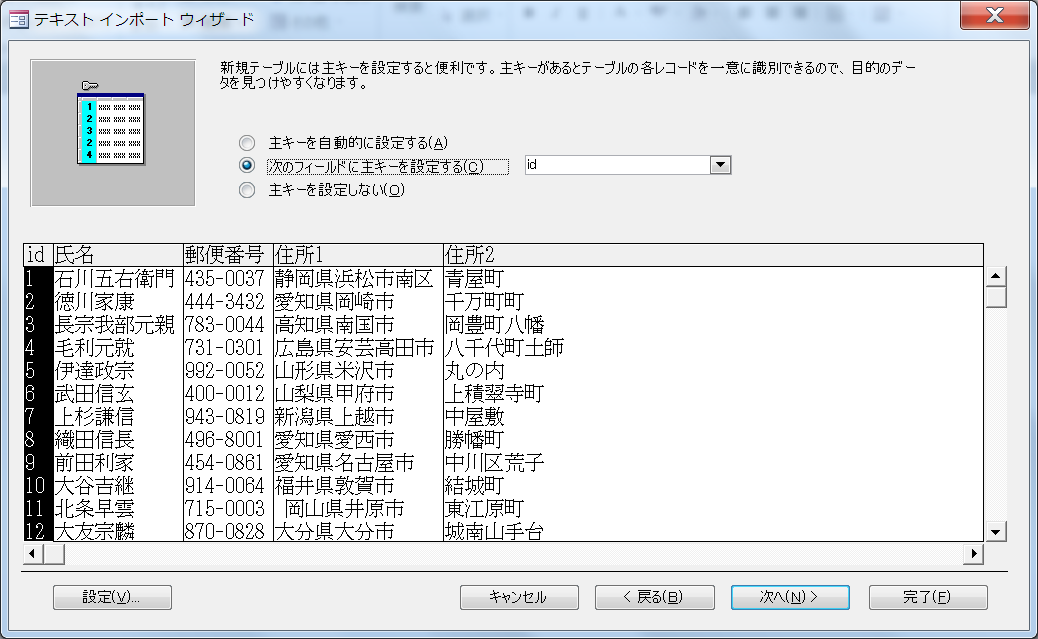 「次のフィールドに主キーを設定する(C)」にチェックが入っており、
